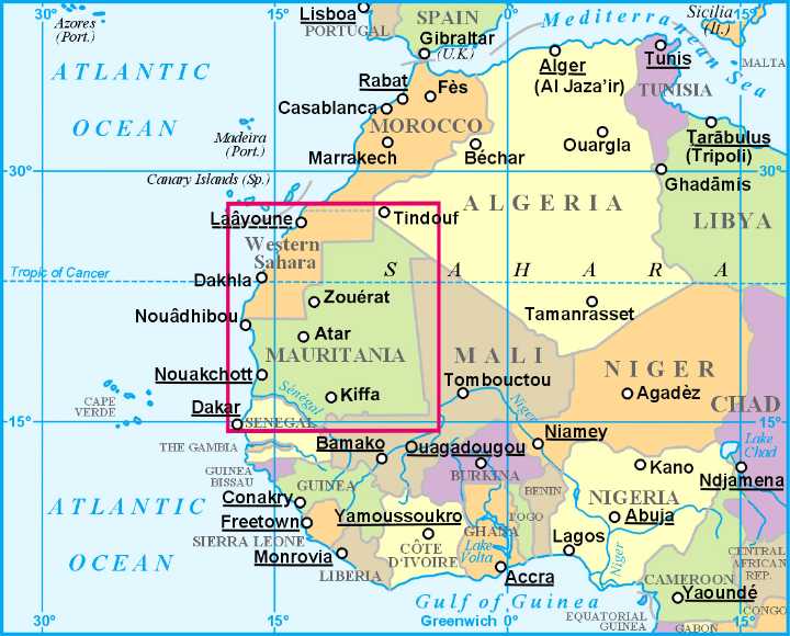 Mauritania and Western Sahara with excellent topographic information on an indexed map with a street plan of central Nouakchot. Vivid altitude colouring with graphics for deserts, flood plains and salt flats shows the terrain. Oases, water wells and numerous spot heights are marked and the map provides plenty of names of geographical features: peaks, mountain chains and rock outcrops, plains, etc.