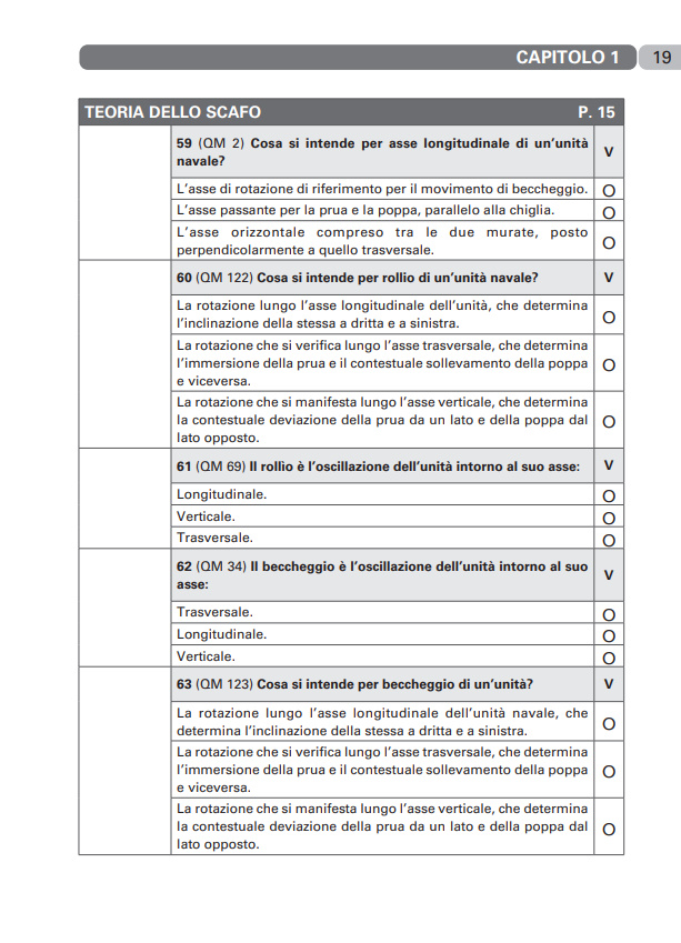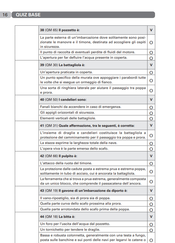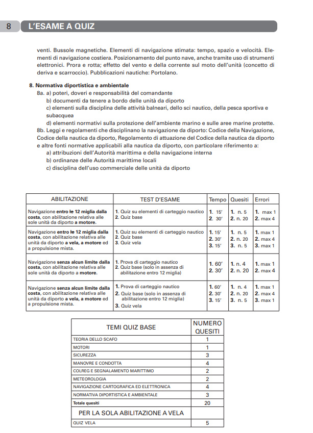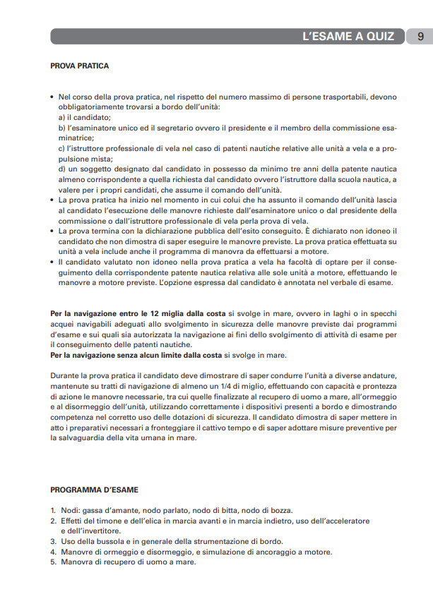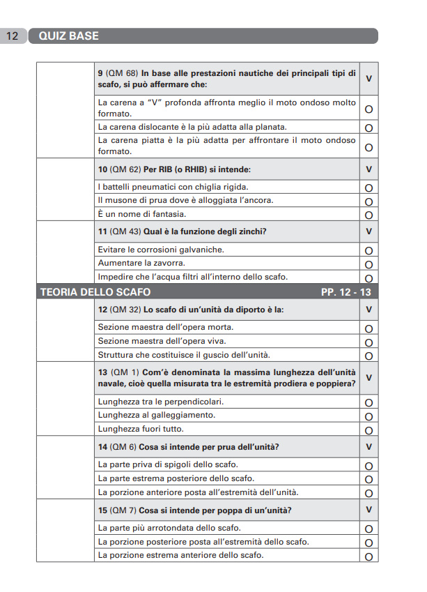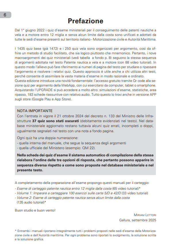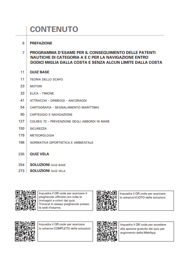 Questo manuale comprende tutti i quiz ufficiali – base e per la vela – organizzati per argomento didattico secondo la sequenza del testo di teoria di Miriam Lettori Patente nautica a vela e a motore. In questo modo l’allievo può affrontare lo studio in modo logico e progressivo, con la possibilità di richiamare facilmente le singole pagine per approfondimenti e ripasso. Un metodo che risulta prezioso anche per chi utilizza altri testi di teoria, perché consente di assimilare l’intero programma ministeriale seguendo un percorso razionale e ordinato.