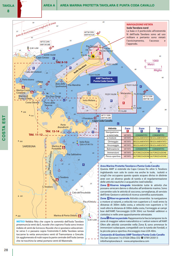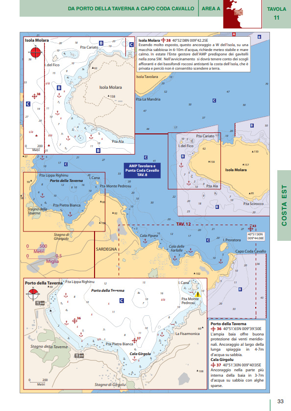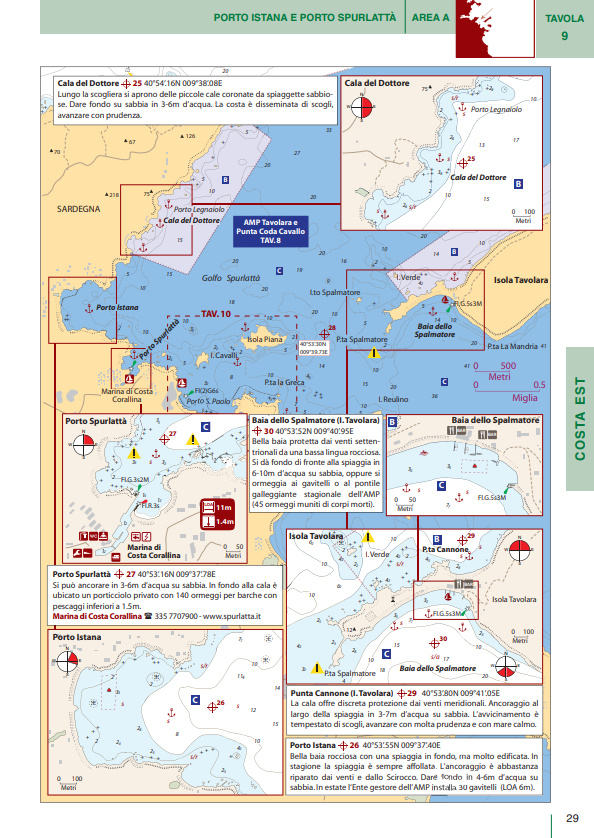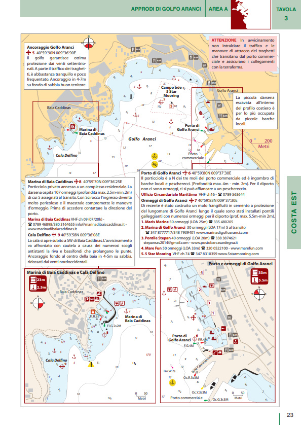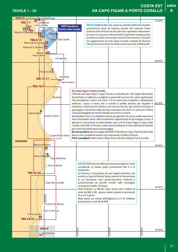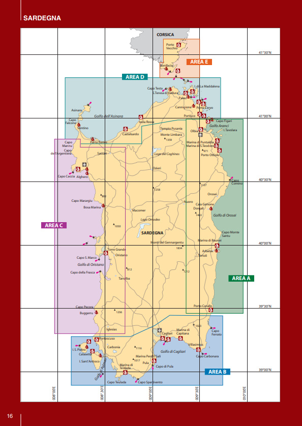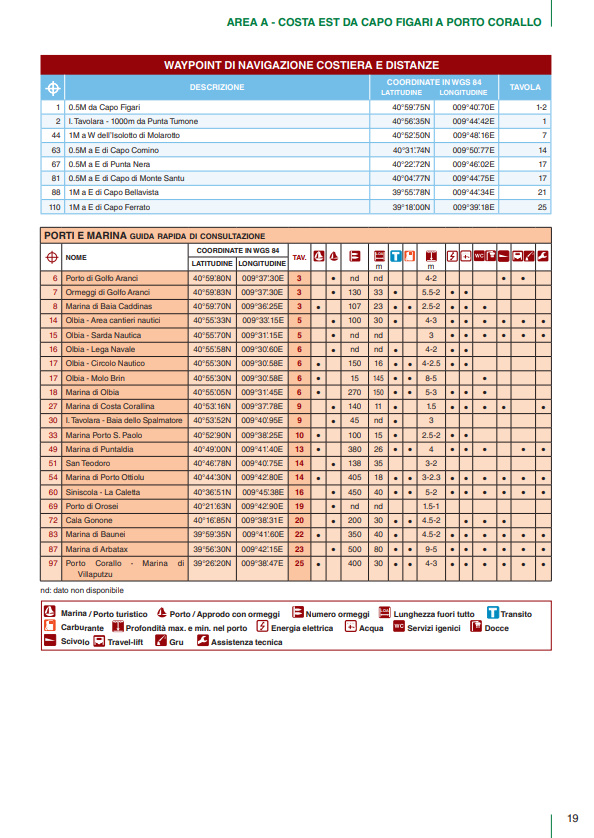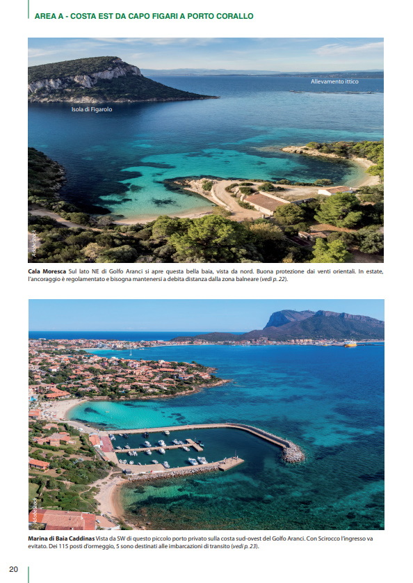 Il volume è suddiviso in cinque macroaree per ognuna delle quali una guida rapida riporta i principali porti e marina della Sardegna con i relativi servizi (colonnine di acqua e corrente, carburante, profondità, assistenza tecnica, ecc.). Basta dunque un rapido sguardo per essere in grado di scegliere il porto più adatto in base alle caratteristiche della propria barca e delle condizioni meteo.