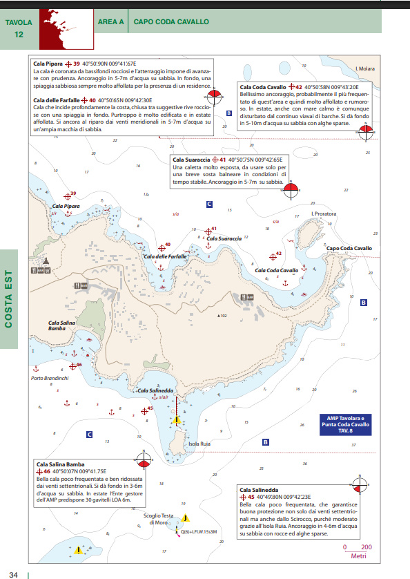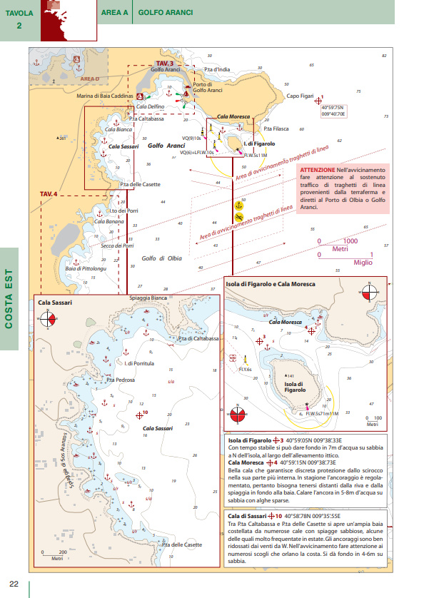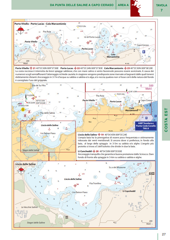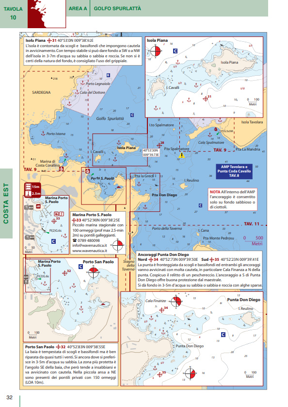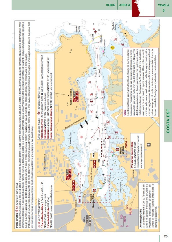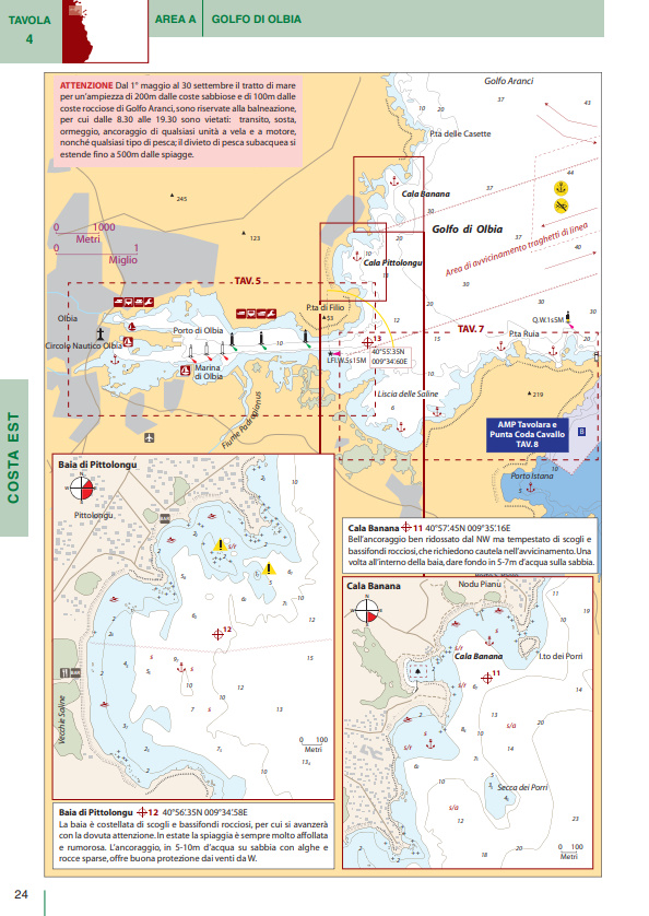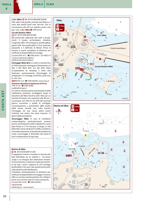 I numerosi piani di porti e baie sono corredati da una ricca gamma di pittogrammi che ne facilitano l’immediata consultazione. In tutti i piani sono presenti due icone che indicano rispettivamente venti di traversia, lunghezza e pescaggio massimi ammessi per l’accesso a porti e marina. Brevi testi completano le informazioni di pilotaggio indispensabili per una navigazione sicura.
