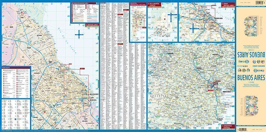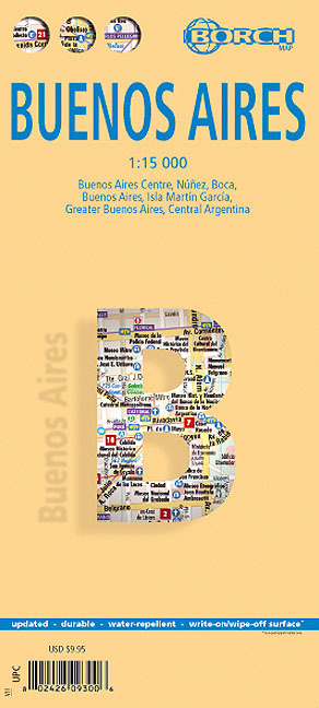 Our soft-laminated folded map of Buenos Aires in the 6th edition shows: Buenos Aires Centre 1:15 000, Isla Martín Garcia 1:18 000, Núnez 1:15 000, Boca 1:15 000, Buenos Aires 1:75 000, Greater Buenos Aires 1:530 000, Argentina Central 1:300 000, Public Transport Buenos Aires, Argentina administrative and time zones, Top 30 Sights. Borch Maps are easy to fold, durable and water-repellent with a wipeable surface. Borch Maps show hotels, museums, monuments, markets, public transport, top sights and points of interest, useful statistics, conversion charts for temperatures, weights and measurements, climate charts showing temperatures, sunshine hours, precipitation and humidity, overview maps, time zones, and much more...