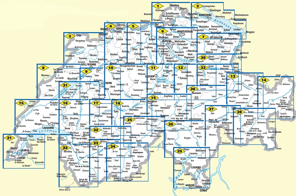 Kümmerly+Frey ha creato questa serie di carte escursionistiche che copre l'intera Svizzera in collaborazione con le organizzazioni escursionistiche cantonali e locali. 32 fogli vi guideranno attraverso le più belle aree escursionistiche e turistiche della Svizzera. Le escursioni proposte sono suddivise nelle categorie "sentiero escursionistico", "sentiero di montagna" e "itinerario alpino". Tutte le carte contengono utili informazioni aggiuntive: alloggi, ristoranti, linee degli autobus con fermate, sport, tempo libero... ecc.
