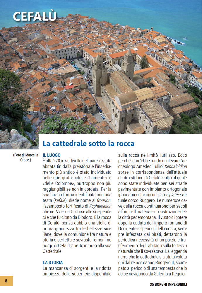 Marcella Croce ha selezionato 35 borghi emblematici, capaci di restituire l’unicità di questa terra antica: insediamenti a picco sul mare o arrampicati sulle creste di montagne aspre, piccoli centri circondati da preziose oasi naturalistiche o nati all’ombra di vulcani che dettano il ritmo della vita, mestieri antichi, tradizioni religiose millenarie ma sempre vive e condivise, severi castelli feudali e dentellate decorazioni barocche.